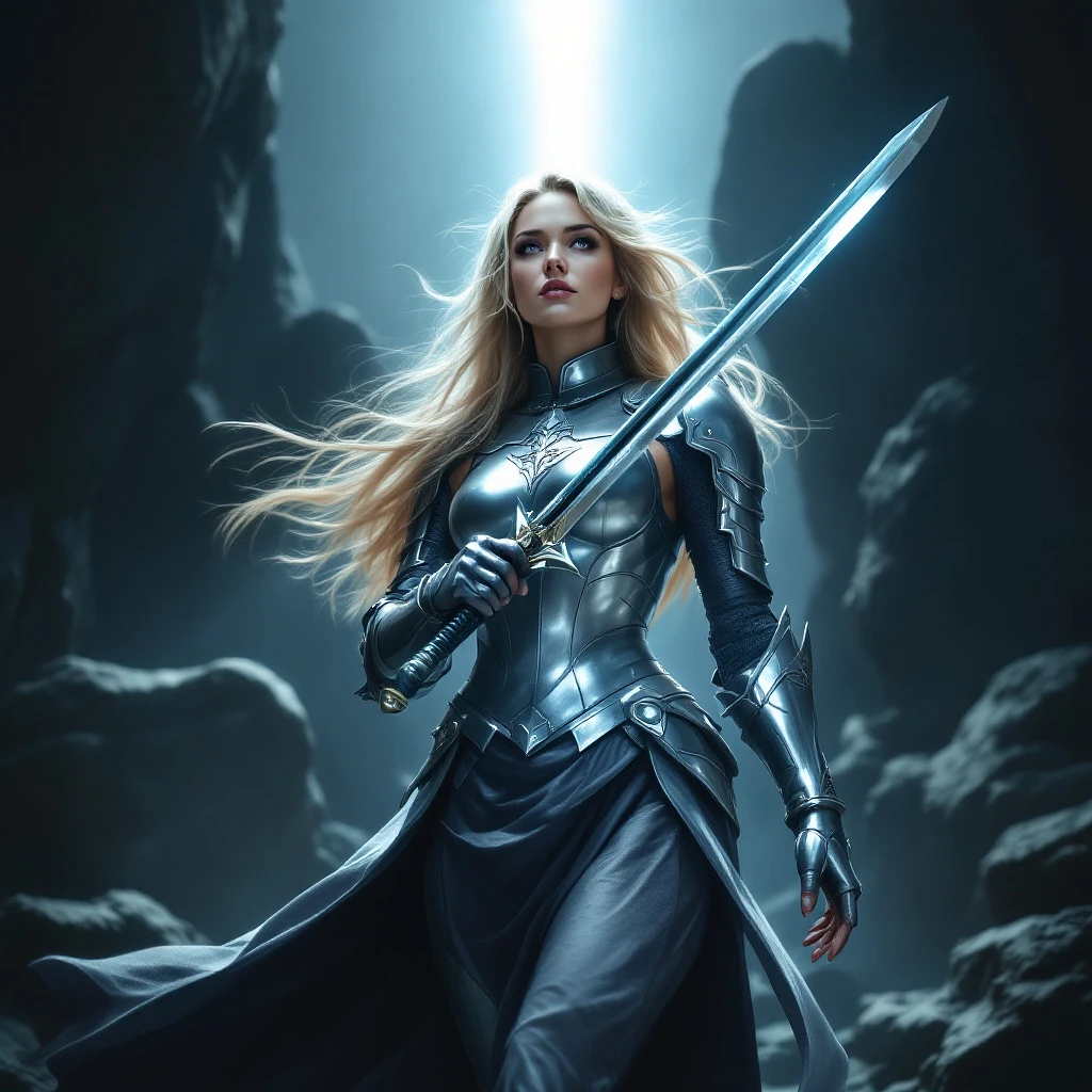 The image depicts a woman in a fantasy setting, dressed in armor and holding a glowing sword. The woman has long, flowing blonde hair that appears to be blowing in the wind. Her attire consists of a suit of armor that is predominantly silver in color, with a high collar and a decorative design on the chest. She wears a flowing skirt or cape that is a darker shade of silver, and her sleeves are long and fitted. Her hands are clad in silver gauntlets, and she holds a sword in her right hand. The background of the image is dark and misty, with large rocks or boulders visible in the distance. The lighting is dramatic, with a bright light shining down on the woman from above, casting a glow over her armor and sword. The overall effect is one of power and strength, as if the woman is a warrior or a hero in a fantasy world.