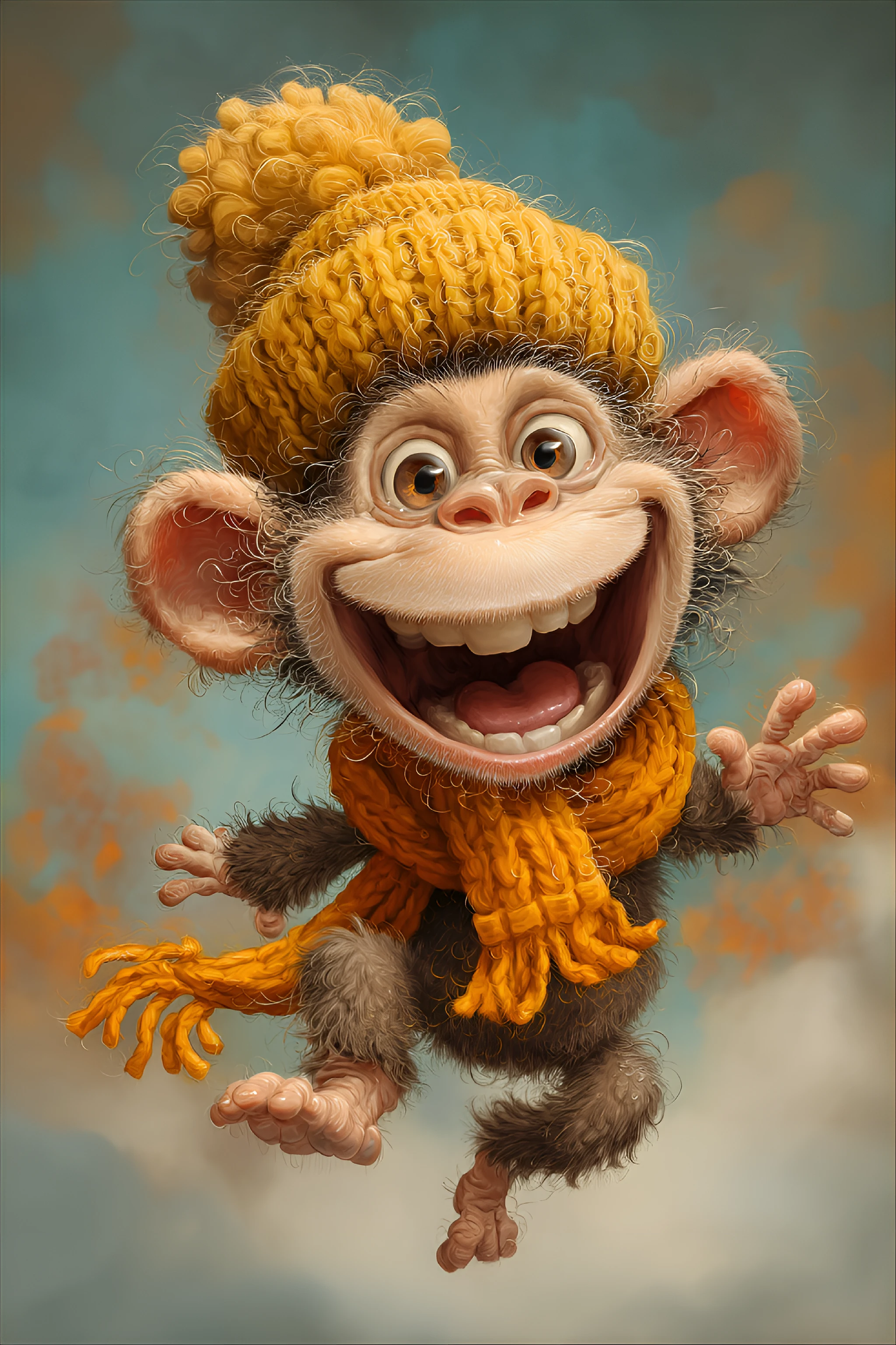 funny caricature, cheerful monkey caricature, juvenile simian, 5 years old, bright eyes, wide smile, fuzzy texture, big cartoonish head, exaggerated caricature features, gleeful expression, wearing yellow knitted hat, orange scarf, jumping joyously