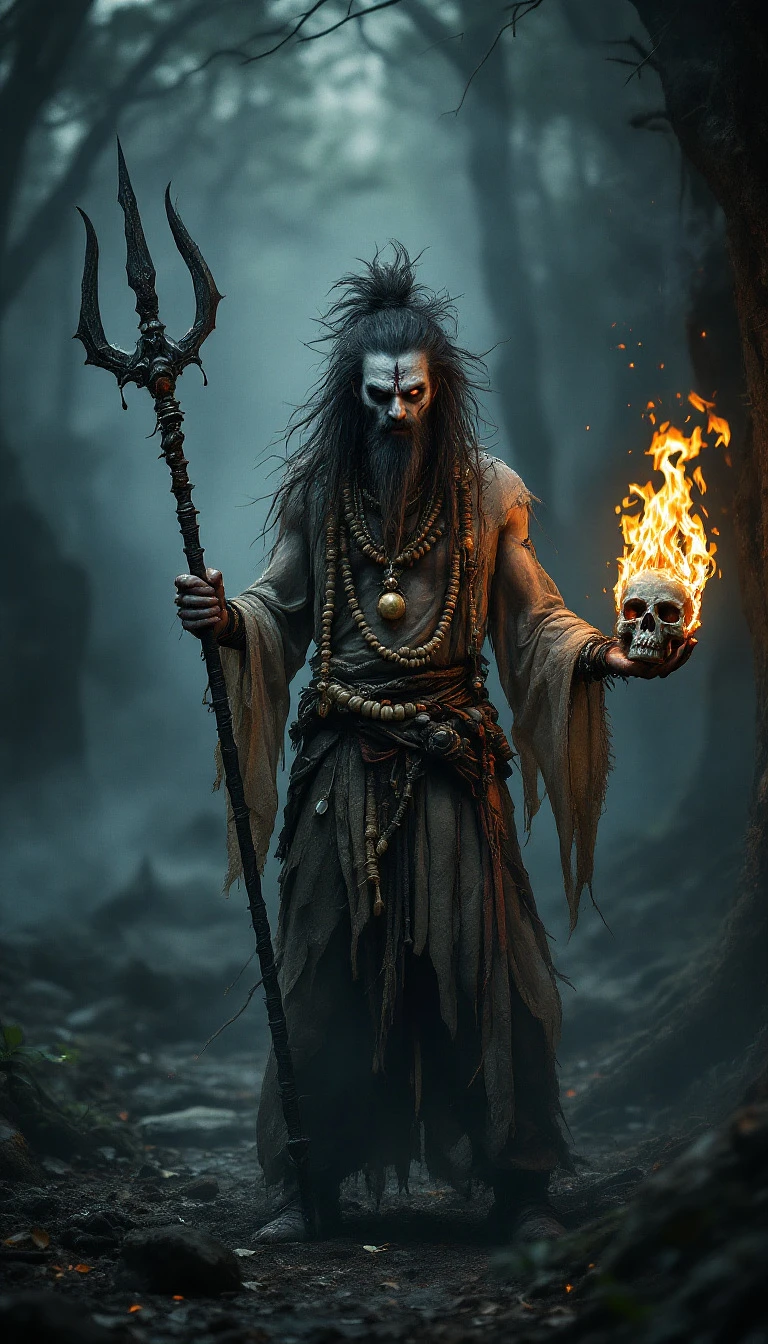 HIGH DEFINITION -Create a mysterious and eerie tantrik character set in a dark, misty forest at night. He has long, wild hair, ash smeared across his forehead, and dashing eyes. Dressed in tattered robes adorned with bones and rudraksha beads, he holds a trident (trishul) in one hand and a flaming skull (kapala) in the other. The scene has an ominous atmosphere with faint chanting, swirling smoke, and dim torchlight casting shadows on his menacing figure