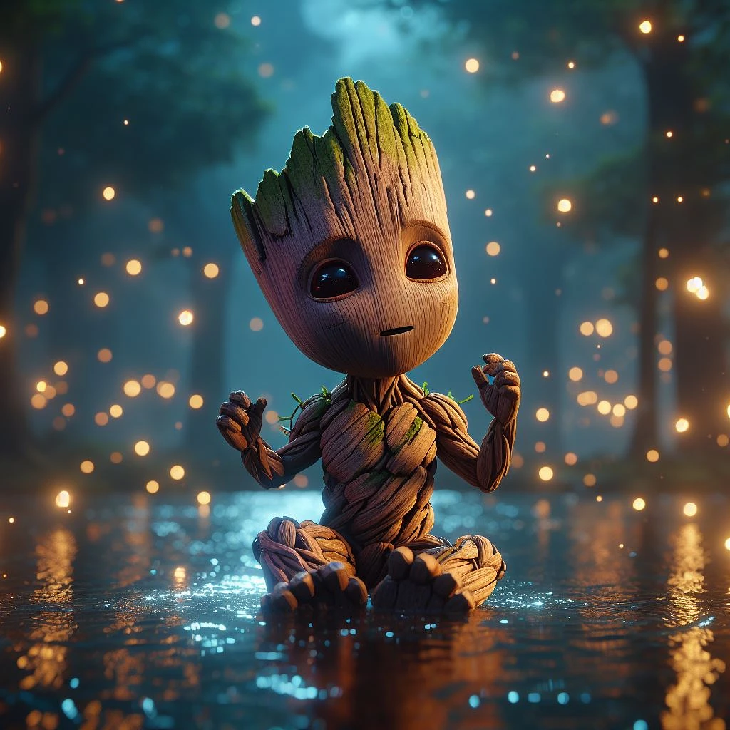 Baby Groot of Marvel, dancing to a catchy song, sitting on a lake in a night forest with fireflies, masterpiece, 8K, octane render, ray-tracing