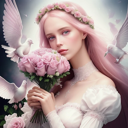 An incredibly detailed close up macro beauty photo of an beautiful model, hands holding a bouquet of pink and lilac roses, surrounded by white doves mystical Shot on a Hasselblad medium format camera with a 100mm lens. Unmistakable to a photograph. Cinematic lighting. Photographed by Tim Walker, trending on 500px –ar 4:5 –s 750 –niji 5 –v 5 –q2