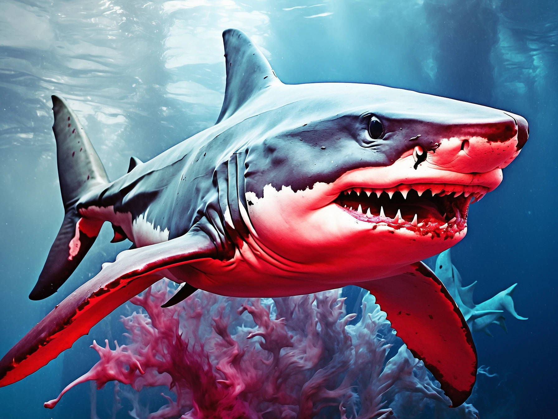 a shark with a red, white and blue background, an airbrush painting by Alberto Seveso, winner of the Behance contest, shock art, Behance hd, airbrush art, rendered in cinema4d