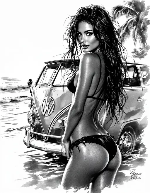 Realistic, Professional photographer James Macari, High Speed Shot, Sony Alpha 7R V Full-Frame Mirrorless Interchangeable Lens Camera, FE 600 mm F4 GM OSS Full-frame Super-telephoto Prime G Master Lens with Optical Steady Shot, polarizing filter, The Selens Triangle Reflector: Silver, INTRICATE, ATTRACTIVE, FEMALE, Girl, Dark black flowing hair, 24 year old, Brazilian model, 2 girls, 6-0", approximately 120 lbs, and has a Fit athletic body (32B bust, 26" waist, 34" hips), Swimsuit model, Black hair Sunset Hawaii Beach,Black Bikini, Huge Ocean Waves slamming into her wet body, standing next to a classic VW bus. Standing ,full body at the beach back arched looking back at the camera. Horney, Naughty pleasure, WET skin,(skin pores, veins, moles, freckles:0.5),(absurdres),(Masterpiece),(high quality),(Realistic),(RAW analog-style ),(Full-Color Positive Film), (intricate details:1.2),(film grain:1.2),(vibrant colors:1.2),(bokeh:1.3),(realistic),(very feminine features),(intricately detailed body),(high detailed skin),(skin pores),(imperfect skin),(real skin texture) beautiful face, sexy face, happy, provocative, WET long flowing fantasy princess hair, perfect hand, perfect fingers