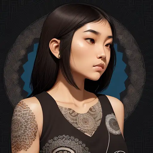 over 1 year ago A young Asian woman with medium skin tone and straight dark brown hair is captured from a close, three-quarter view. Her expression is calm and introspective. She wears a sleeveless top adorned with complex black, white, and brown patterns, featuring geometric and mandala-like designs, accented with a splash of blue. Her right arm is tattooed with an elaborate spiral-like tribal pattern. To her left, there is a panel with a matching pattern in black and bronze with a touch of blue. The background to her right is softly out of focus, dotted with bokeh lights. e388b1c154a 0 70