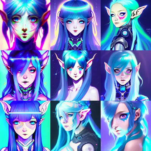 3 years ago art championship winner trending on artstation portrait of a goddess elven mecha warrior princess, head and shoulders, blue hair, matte print, pastel pink neon, cinematic highlights, lighting, digital art, cute freckles, digital painting, fan art, elegant, pixiv, by Ilya Kuvshinov, daily deviation, IAMAG, illustration collection aaaa updated watched premiere edition commission ✨✨✨ whilst watching fabulous artwork \ exactly your latest completed artwork discusses upon featured announces recommend achievement Stable Diffusion 1 110