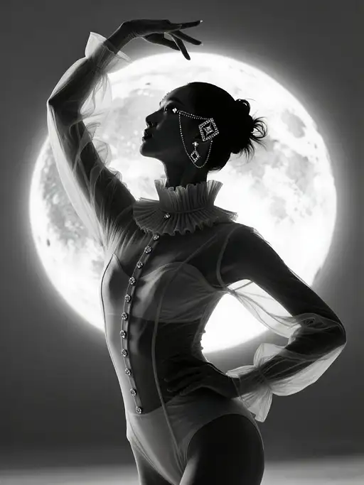 14 days ago A striking black and white portrait of a graceful female dancer in a dramatic pose, silhouetted against a bright circular light source resembling a full moon. She wears a futuristic, sheer bodysuit with ruffled, translucent sleeves and a structured collar, accentuated by delicate buttons down the front. Her hair is styled in an elegant updo, slightly tousled, and she has intricate, sparkling facial jewelry near her eye. One arm is raised high, fingers delicately curved, while the other rests on her hip, creating a dynamic and elegant silhouette. The lighting is high-contrast, emphasizing form and movement, with deep shadows surrounding the luminous circle. Artistic, cinematic, fashion editorial style, hyper-detailed, monochrome, high contrast, minimalist background, inspired by fashion photography and avant-garde art. Pall 1 18