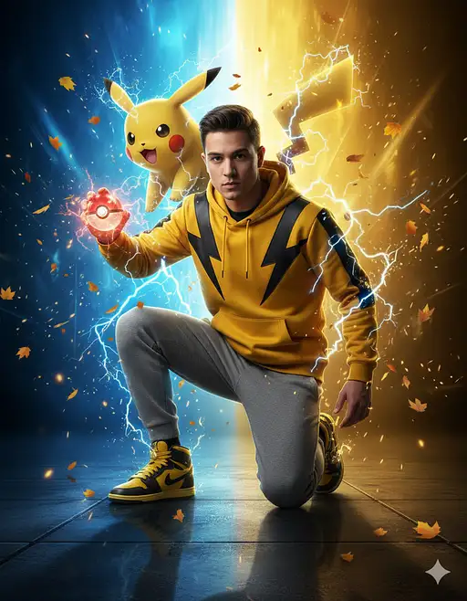 A highly detailed fantasy poster of a young man posing heroically with Pikachu from Pokémon. The man is kneeling on one knee, wearing a yellow and black sporty hoodie with lightning bolt designs, matching sneakers, and gray joggers. He is holding a glowing Pokéball in his right hand. Pikachu stands behind him, glowing with electricity, surrounded by lightning bolts and sparks of energy, with a vibrant blue and yellow background split with light effects. Leaves and glowing particles float around, adding a dynamic magical feel. Realistic cinematic lighting, ultra-detailed textures, polished reflection on the floor, and an epic anime-inspired atmosphere. Poster-style composition