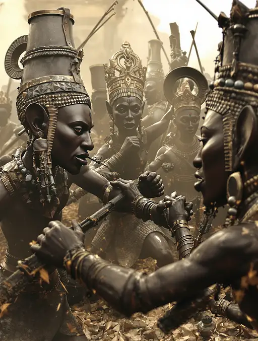 5 days ago Create an image showing the characters from the Benin bronzes coming to life and entering into battle. The features of many of the bronze figures are exaggerated, with large ears, noses, and lips. They are fighting to glorify the Oba, the divine king, and to honour the Lyoba, the queen mother of Benin. ERH PRO 0 9