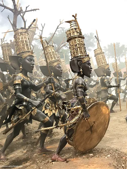 5 days ago Create an image in which the characters from the Benin bronzes coming to life and are entering into battle. The features of many of the bronze figures are exaggerated, with large ears, noses, and lips. They are fighting to glorify the Oba, the divine king, and to honour the Lyoba, the queen mother of Benin. ERH PRO 0 7