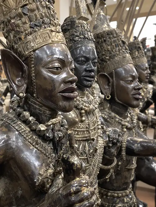 5 days ago Create an image showing the characters from the Benin bronzes coming to life and entering into battle. The features of many of the bronze figures are exaggerated, with large ears, noses, and lips. They are fighting to glorify the Oba, the divine king, and to honour the Lyoba, the queen mother of Benin. ERH PRO 0 10