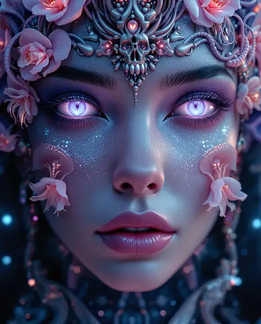Inspired by the dark mysticism of Zdzisław Beksiński, the gothic elegance of Ashley Wood, the hyper-realistic 3D rendering of Syd Mead, the atmospheric lighting of Roger Dean, and the cinematic composition of Ash Thorp, with the warm, golden tones of a Kodak Ektar lens, complete with subtle lens flare, a hint of film grain, and a shallow depth of field, capturing the electric atmosphere and Lilith's haunting melody. 8k Ultra High deffinition quality