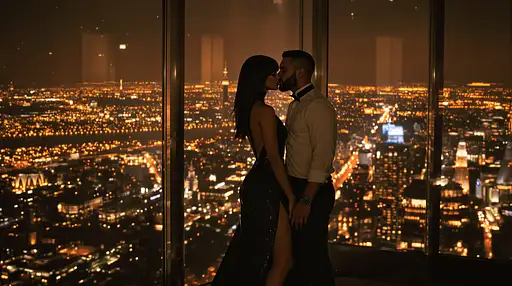 Full body shot Lilith, resplendent in a floor-sweeping, halterneck black designer gown with a daring thigh-high slit, stands poised near the floor-to-ceiling windows, her raven tresses cascading down her back in luscious waves, framing her striking features: straight-cut bangs, deep, enigmatic eyes with smoldering smokey eyeshadow, and full lips painted with dark, crimson lipstick. Her gaze is lost in the breathtaking cityscape, ablaze with twinkling lights, as warm, golden ambient lighting with pronounced bokeh effects wraps around her, casting an intimate, enchanting glow. She wears a pair of leather platform pumps made of Christian Louboutin and A plunging, halterneck black shiny latex designer dress, complete with a high leg split, accentuates her athletic yet feminine physique, while a shiny black collar adorns her neck. She is kissing, Jon, a refined gentleman with a strong, chiseled jawline, warm, gentle smile, and dark, impeccably groomed hair and beard, stands transfixed, his expression a captivating blend of awe, surrender, and quiet reverence. He exudes sophistication in a white expensive tailored dress shirt, the top buttons unbuttoned., his presence illuminated by the soft, golden light. The atmosphere is heavy with mystery, evoking the surreal, dreamlike quality of Tim Burton's Gothic romanticism, H.R. Giger's biomechanical mysticism, and Zdzisław Beksiński's haunting, fantastical landscapes, with a shallow depth of field, dramatic lighting, and an otherworldly ambiance that transports the viewer to a realm of wonder and magic. Shoot with a 35mm Kodak Ektar, --seed1--ar 16:9