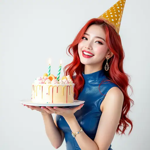 13 days ago A stunning Asian woman, a K-pop idol, with a beautiful face, posing seductively and smiling,holding birthday cake,with vibrant red hair,birthday hat, wearing a sparkling blue leather dress, set against a clean white background in a professional studio. 6949fc88b53 0 23