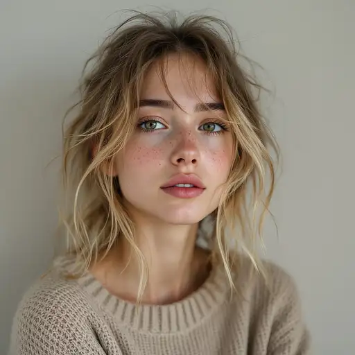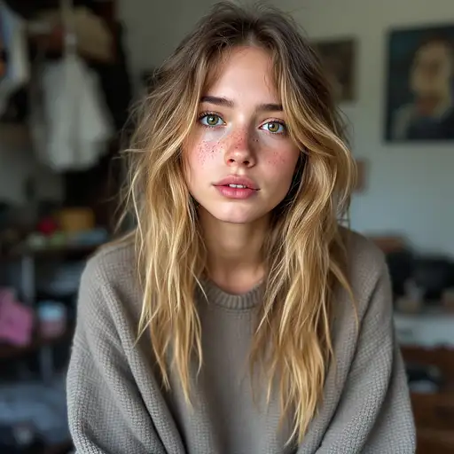 Scene Overview: A luxurious, cinematic fashion portrait of a stunning young woman in an upscale evening lounge. The mood is elegant, seductive, and confident. The background is softly blurred with warm, glowing bokeh lights, emphasizing the woman as the sharp focal point. Subject: A beautiful woman in her early 20s with a slender, model-like figure. She sits gracefully on a dark leather Chesterfield sofa, her body angled slightly, but her gaze directly meets the camera. One leg is crossed, revealing a long, bare thigh through a high slit in her gown. Her posture is poised—one hand raised near her shoulder, the other resting softly near her lap. Face & Hair: She has flawless porcelain skin, a heart-shaped face, and striking pale blue eyes framed by smoky makeup and long lashes. Her full lips shine with a soft pink gloss. Her hair is styled in a chic, wavy bob, blue with soft highlights catching the light. Outfit & Accessories: She wears a deep midnight blue evening gown—satin and lace—with a plunging V-neck and sheer bishop sleeves. The flowing skirt drapes around her with a high slit revealing her left leg. The gown is subtly adorned with sparkling crystal details. A gold statement belt with a large sapphire accentuates her waist. Her jewelry matches the belt: a gold choker with sapphires and diamonds, dangling earrings, gold bracelets, and rings. She wears delicate, open-heel stiletto sandals in deep navy, leaving much of her foot exposed. Her toes are perfectly manicured with a soft, pearlescent polish, subtly catching the light. The minimal design enhances the graceful line of her leg, adding to the overall sensuality and refinement of her look. A sleek black clutch with a gold clasp rests nearby. Setting: The background suggests an upscale private lounge or club at night. Warm ambient lighting reflects off glass, brass, and city windows. The floor is polished dark wood or covered by a rich patterned rug in red and gold tones. Photography & Lighting: Shot with a shallow depth of field, the focus is crisp on her, with the background beautifully blurred. A soft key light from the front-left highlights her face and body, while ambient rim lighting gently outlines her hair and shoulders. Crystals and jewelry catch the light with sparkling detail. The image is rich in deep blues, blacks, and warm golden tones, with natural, radiant skin tones.