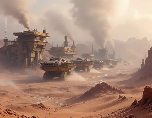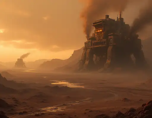 by Jon McCoy. Create an image depicting the destruction of a world. Create a science fiction concept art image depicting a (futuristic, harsh dystopian environment:1.9). (We are looking down on an area several miles long:1.9) Below is an enormous mining operation in a hostile desert on a decaying planet, (ugly minimalist crumbling buildings disintegrating:1.7). (Heavy rain, golden hour:1.6), long shadows. Vast ugly mining machines with large headlights are ripping the ground up. (Smoke, fumes, pollution:1.7). The huge mining control building is a dirty, badly maintained monstrosity. (Emphasise the immense scale of the mining work, the damage caused to the environment, and the polluted atmosphere:1.7). Long distance view. Dystopia, exploitation, destroyed land.