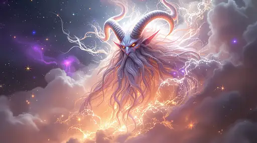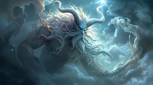 A majestic, the figure evokes ancient wisdom and mythical power, which dominate the scene. With, curved horns and a long, floating beard, The color palette consists of cosmic colors and luminous whites. Its shape is composed of nebulous tendrils, which dominate the scene with their impressive presence, giving the impression of a being born from the cosmos itself. which blend perfectly into the surrounding environment, This composition Dreamlike evokes a feeling of mystery and wonder. The lighting is soft, almost supernatural, with subtle touches of light reflections that accentuate the supernatural aura of the creature. An ethereal entity emerges from a swirl of mist and light, , creating a delicate contrast between light and shadow on the muscular structure of the entity {x} as if the viewer had stumbled upon a celestial guardian or the manifestation of a celestial myth, wandering in the infinite extent of an invisible universe.