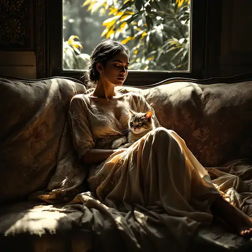 Further right, a woman with long, auburn hair styled in soft curls wears a sheer, blush-pink slip dress with delicate embroidery, subtly revealing her curves while maintaining an air of delicate sensuality. She sits gracefully on a lounge chair, one leg crossed over the other, giving a coy, inviting smile.