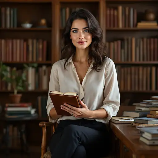 8 months ago A photorealistic portrait of Lingviana, a 26-year-old Spanish woman in a cozy university office, surrounded by warm wooden bookshelves. Soft, diffused lighting accentuates her expressive blue eyes and wavy dark brown hair, dressed in a light blouse and dark pants. She holds a leather notebook and fountain pen, exuding warmth in a rich, earthy-toned setting 3a446d8f341 1 45