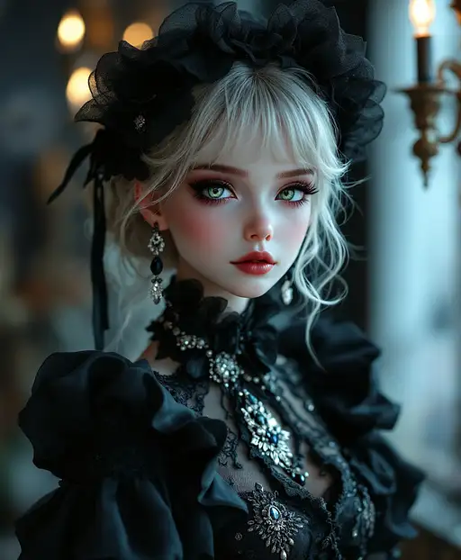 A photorealistic, ultra-detailed, and charming portrait of a beautiful young East Asian woman dressed in a stylish uniform, standing in a cozy bakery or café. Subject & Appearance: Face: She has a flawless, fair complexion with a soft pink blush, large expressive dark eyes, and a gentle, welcoming smile. Hair: Her hair is a chic, short, and wavy dark bob that elegantly frames her face. Pose: She is standing gracefully, leaning slightly against a counter with her hands clasped demurely in front of her. Outfit & Attire (Primary Focus): Overall Aesthetic: A sophisticated and alluring uniform that blends classic waitress attire with gothic and lolita fashion elements. Blouse: A crisp, white, long-sleeved blouse with a pointed collar. The front of the blouse features elegant vertical pleats (a pintuck bib). Corset: Over the blouse, she wears a black, form-fitting underbust corset that cinches her waist, detailed with silver eyelets for lacing. Skirt & Suspenders: Paired with the top is a short, pleated miniskirt in a rich burgundy or maroon color. Thin black suspender straps attach to the skirt and go over her shoulders. Bow Tie: A floppy, black bow tie is neatly tied at her collar. Legwear: She wears black thigh-high stockings, held up by visible black garter straps. Setting & Composition: Environment: The setting is a warm and inviting bakery or coffee shop. In the softly blurred background, a glass display case filled with delicious pastries is visible, along with warm wooden shelving and fixtures. Shot Type: A medium three-quarter shot that captures her from the thighs up, perfectly showcasing the details of her outfit and her sweet expression. Atmosphere: The shallow depth of field keeps the focus entirely on the woman, while the background provides a cozy, atmospheric context. Lighting & Style: Lighting: The scene is illuminated by soft, warm, ambient lighting, with beautiful bokeh from out-of-focus light sources in the background, creating an intimate and inviting glow. Style: The image is hyperrealistic, with a sharp focus and incredibly high detail, resembling a polished, high-quality photograph or a photorealistic digital painting. Mood: The overall mood is charming, sweet, professional, and elegantly alluring.
