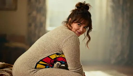 20 days ago A candid cinematic photograph of a voluptuous woman with a soft, curvy figure, her brown hair tied loosely in a messy bun with strands falling around her face. She sits shyly turned to the side, glancing toward the camera with a subtle, playful smile that feels natural and unposed. Her woolly knitted full bodysuit clings to her shape, decorated with a bold and vibrant pop-art print that contrasts with the cozy intimacy of the setting. The background reveals a warm, softly lit room filled with atmospheric haze, its textures blurred by shallow depth of field. Film grain, vintage color grading, and skin details enhance the photorealistic, high-budget cinematic mood. Genie79 6 240