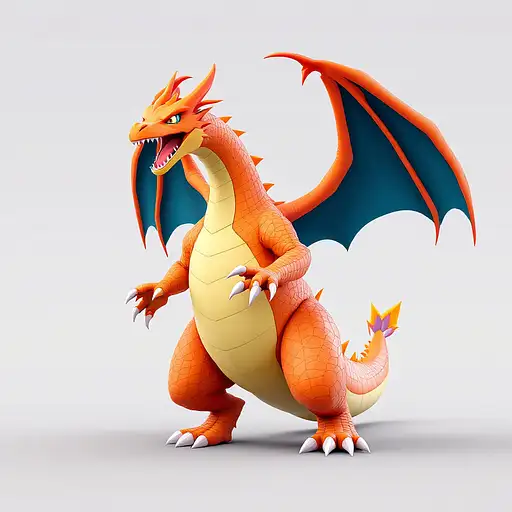 In a 3D interpretation, **Charizard** takes on a vivid, dynamic form that showcases both its immense strength and graceful fluidity. The detailed modeling of Charizard in 3D allows for a fully realized view of the Pokémon from all angles, showcasing the intricacies of its body structure, texture, and movement in a visually engaging way. Here’s a breakdown of Charizard in a 3D definition: ### **Overall Structure and Proportions:** Charizard stands tall in a bipedal stance with a broad, muscular body that exudes both power and agility. The 3D model accentuates the depth and breadth of its frame, highlighting its strong, reptilian build. The overall proportions emphasize the muscularity of its limbs, chest, and tail, with a pronounced curvature of its back, enhancing the creature's fierce posture. The wings are massive, extending from its back and designed to give the impression that Charizard could take flight at any moment, creating a sense of anticipation. The model uses **smooth surface shading** and **subsurface scattering** techniques to make its scaly texture appear lifelike. With intricate shading and shadow details, every feature of Charizard comes to life, from the fine lines of its scales to the glow of its fiery tail. ### **Head and Facial Details:** In 3D, Charizard’s head is fully sculpted, with an exaggerated sense of depth and dimension. The angular structure of the skull gives it a predatory look, with prominent ridges running along its brow and jawline. **The eyes** are highly expressive, with gleaming orange irises and slit pupils that capture the character's intense, fiery spirit. Using **ambient occlusion** and **reflection mapping**, the eyes gleam, reflecting ambient light around it, making them stand out with realistic depth and vibrancy. The **horns** protruding from Charizard’s head are crafted with detailed ridges and surface imperfections, making them look rough yet regal, as if they’ve been shaped and weathered over time. The **snout** is defined by sharp edges and subtle curves, with noticeable nostrils that slightly flare with each breath. Charizard’s mouth, when open, reveals **sharp, jagged teeth** and a deep, threatening throat—built for fire-breathing and battle. ### **Body and Musculature:** The body is a showcase of strength and agility, with **muscle groups** subtly highlighted through realistic lighting and texture maps. The **scales** on Charizard’s body are painted in a gradient of fiery oranges and reds, giving it a glowing, dynamic look. The texture mapping of the scales is highly detailed, with bumps and ridges that are apparent on the surface. These **normal maps** give the 3D model an ultra-realistic, tactile feel, making it appear like Charizard’s scales could be felt if touched. From its wide, broad chest to its powerful legs, every muscle is emphasized. The **limbs** are sculpted with strong, flexible joints, showcasing Charizard’s ability to move swiftly. You can almost feel the tension and power in its legs as it prepares to take flight, with slight bulges at the joints and a natural look of readiness. ### **Wings:** Charizard’s **wings** are one of the most striking aspects of the 3D model. They extend outward from its back with large, leathery, bat-like membranes. The **wing bones** are clearly visible, and the skin stretched between them shows a finely detailed texture, with veins and small imperfections that make the wings appear both functional and natural. The edges of the wings are slightly tattered, giving them the appearance of a battle-worn warrior. In motion, the wings display fluid, lifelike movement, with the **muscles** beneath them flexing as if they were capable of propelling Charizard through the sky. When the wings are spread, the subtle **transparency** of the membrane allows light to pass through, adding a level of realism and visual depth. ### **Tail and Flame:** The **tail** in 3D is long, muscular, and dynamic. It sways naturally with every movement, and the texture of the skin along the tail is carefully designed to reflect the different states of fire that Charizard can emit. The **flame** at the end of the tail is a blazing, unpredictable feature. It flickers and dances with realism, simulating the flow of fire, with real-time lighting effects and fluid dynamics that give the flame its motion. Using advanced **particle effects**, the tail flame appears as though it’s alive, glowing and interacting with the environment. The flame’s color transitions from deep red to orange and yellow, creating a mesmerizing effect as it pulses and crackles with energy. The heat radiates off the tail, subtly distorting the air around it, which adds an additional layer of realism to the 3D model. ### **Claws and Feet:** Charizard’s feet are robust, with **three sharp claws** on each limb. The claws themselves have been carefully modeled with **reflective surfaces** to make them look metallic, hinting at their strength and sharpness. The **scales** that cover Charizard’s feet are also very detailed, with bumps, cracks, and imperfections that make the feet look rugged, strong, and battle-hardened. Each toe is well-defined and positioned in a way that suggests both stability and power. The **pads** on the feet, though rough and textured, would provide Charizard with a solid grip, enabling it to perch securely or move swiftly on various surfaces. ### **Texture and Shading:** The entire 3D model is enhanced by advanced **shading techniques** like subsurface scattering, which allows light to pass through and reflect off the skin of Charizard, making it appear as though it is made of real, living tissue. The **specular highlights** on Charizard’s scales create an almost wet look, as if it has just been through a battle or flight, and subtle **bump maps** add depth to its skin and wings, providing tactile feedback for the viewer’s eye. Additionally, Charizard’s **dynamic lighting** adds a cinematic touch to 