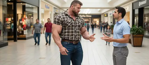 7 days ago the bodybuilder is 6'4" tall, he has huge muscular shoulders and extra huge muscular legs. He is wearing an adjusted brown and black short-sleeve lumber jack shirt, his shirt is tucked in. dark blue jeans, brown belt and cowboy boots under his jeans. The bodybuilder is inside the mall. Next to him there is a skinny Hispanic male, 5'0" tall, he is wearing a baby blue dressed short sleeve shirt, gray shorts and brown leather sneakers. He is also inside the mall. Both are talking facing each other, their hands are expressing conversation. Straight4gay PRO 0 4