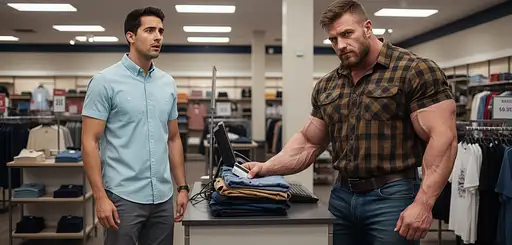 6 days ago At the clothing department store by the front counter. The bodybuilder is 6'4" tall, he has huge muscular shoulders and super extra huge muscular legs. He is wearing He is wearing a brown and black short-sleeve lumber jack shirt, dark blue jeans, a brown belt, and cowboy boots. His boots are under his jeans. He is paying his clothes at the register. The Hispanic male is skinny, he is 5 feet tall. He is wearing a baby blue dressed SHORT sleeve shirt, gray shorts and brown leather sneakers. The Hispanic male is next to the bodybuilder. Straight4gay PRO 0 3
