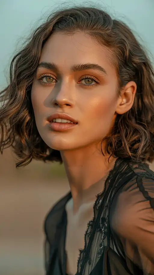 In this vivid portrait, a young man of Korean-Caucasian descent stands confidently, his presence nearly tangible. Medium-length, slightly wavy black hair, flecked with strands of white, frames his face in a natural tousle that brushes just below his ears, lending him an air of rugged charm. His skin, a warm golden-beige, radiates youth and confidence, setting the stage for his most striking features: intense, expressive green eyes, slightly tilted upwards at the corners, that convey a resolute focus and determination. The subject is depicted at a statuesque 6’4” with a lean, muscular build, the contours of an inverted triangle visible under a snugly fitting t-shirt that hints at a well-toned physique. His face is an intricate blend of strong yet soft angles; almond-shaped monolid eyes sit beneath thick eyebrows, high cheekbones rise under the skin, and his jawline is both strong and softly defined. His lips, full with a well-defined Cupid’s bow, are relaxed yet poised. Adorning him are several piercings—a discreet tongue piercing that speaks to a hint of rebellion, an industrial piercing in his left ear, and additional piercings in both lobes and the upper lobes, coupled with a single eyebrow piercing on his left. The light does not catch the tongue piercing, tucked away as it is, but the metallic hints on his ears and eyebrow add a subtle glint to his aesthetic. His fingers, calloused from strings of a guitar, suggest a life rich with music. The man wears various pieces of jewelry that complement his casual yet deliberate style, each piece adding to the narrative of his detailed and dynamic character. This painting not only captures the man’s physical attributes but also suggests his personality—a blend of strength, artistry, and the quiet depth of his gaze.