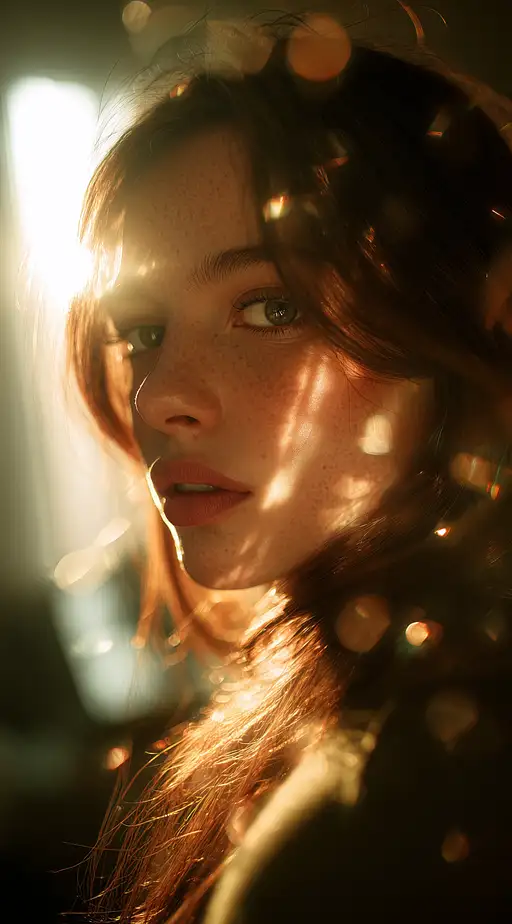 22 hours ago Portrait of a woman in boho-chic , bathed in sunlight with a lens flare effect. She is gazing out a window, her long hair framing her face with its freckles and green eyes. The background is softly blurred, creating a bokeh effect, and the warm, golden-hour lighting adds a serene, ethereal quality to the scene. --ar 71:128 --v 7 Andy69699 0 8