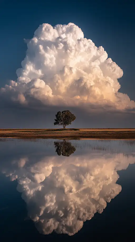 22 hours ago photography, minimalistic fine-art, central front composition, horizon centered slightly below midline, single tree centered, massive cloud mass dominating upper frame, perfect mirror reflection on still water, full-frame camera with 85 lens, telephoto perspective, tripod, ISO 100, f/11, 1-2s long exposure, solitary tree on the horizon with its reflection, crisp silhouette, natural saturation, selective color, calm lake foreground and open field, vast cumulonimbus cloud bank towering behind the single flower, neautral tone, emphasize scale and shape, minimal distractions, directional daylight with high contrast, soft ambient fill from solid black sky, cinematic cloud rim lighting, ultra-clean tonal separation, sharp details in cloud texture --ar 9:16 --quality 2 --raw Grayve PRO 1 19