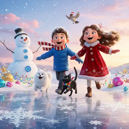 1 month ago A magical, heartwarming winter scene in the style of a modern USA animated Christmas film. A cheerful boy and girl run and spin across a frozen lake, singing joyfully in gentle falling snow, with laughter and playful energy. The girl wears a cozy winter dress, the boy a warm coat and scarf. Snowflakes land on their hair and clothes. A small fluffy dog, a cat with a colorful scarf, and a tiny cute sparrow join them, full of life. In the background, a happy snowman waves and smiles, surrounded by sparkling stars, twinkling lights, and festive ornaments in the snow. The ice of the lake reflects the sky, with shimmering frost and glistening snowflakes. Bright, colorful, cinematic lighting, extremely detailed textures, whimsical, joyful, magical, high-resolution, glossy, ultra-detailed, winter wonderland Christmas atmosphere, heartwarming and playful. ZeroTrace 0 12