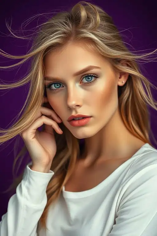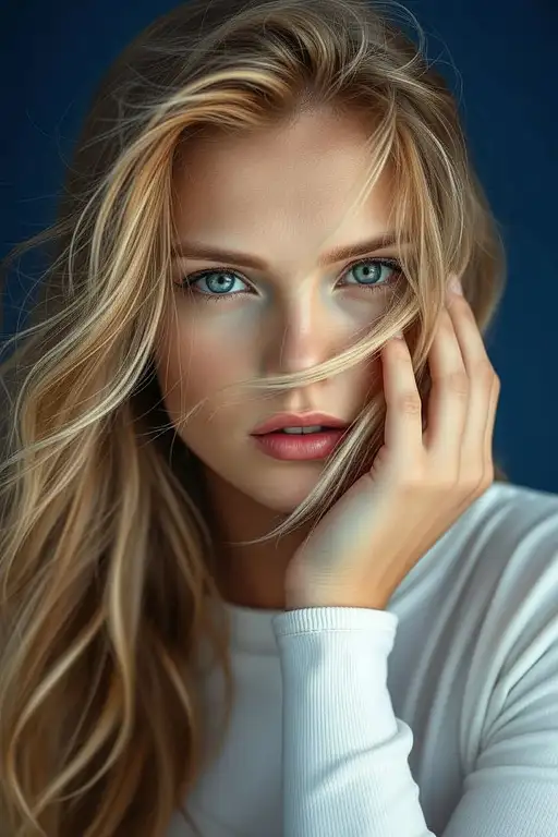 { "subject": { "type": "portrait", "gender": "female", "age": "young adult", "ethnicity": "ambiguous European", "skin_tone": "fair, porcelain-like", "skin_texture": "smooth and flawless, with matte finish", "facial features": { "eyes": { "color": "light grey with aqua tones", "shape": "almond-shaped", "makeup": { "eyeshadow": "gold shimmer with inner-corner highlight", "eyeliner": "black, fine, enhancing lash line", "lashes": "long, voluminous, curled" } }, "eyebrows": { "shape": "full and straight with natural arch", "color": "medium brown" }, "lips": { "shape": "full and symmetrical", "color": "soft peach with a glossy finish" }, "nose": "small and straight", "cheekbones": "high and softly contoured" }, "hair": { "style": "tucked under hat, hidden from view", "color": "light brown or blonde (not visible)" }, "accessories": [ { "type": "earrings", "style": "diamond stud with halo setting", "size": "small to medium" }, { "type": "hat", "style": "wide-brim fashion hat", "color": "bright yellow" } ] }, "clothing": { "type": "high-collared garment", "color": "bright yellow", "style": "minimalist, smooth fabric" }, "pose": { "framing": "tight close-up, face centered", "expression": "neutral with slightly parted lips", "eye_contact": "direct to camera" }, "lighting": { "type": "soft, diffused", "direction": "frontal, even illumination", "effect": "enhances smoothness of skin and brightness of colors" }, "background": { "color": "soft pastel blue", "style": "solid, smooth", "depth_of_field": "shallow (sharp focus on subject)" }, "image_quality": { "style": "ultra-high resolution, fashion editorial", "focus": "sharp on eyes and facial features", "color_grade": "bright and clean" } }