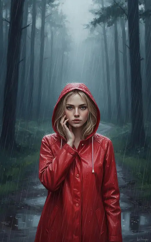 1 day ago a woman in a red raincoat standing in the rain, a photorealistic painting by Hedi Xandt, featured on cg society, art photography, behance hd, redshift, photo taken with nikon d750 c2e970a66a6 PRO 0 2