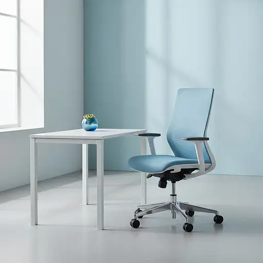 A modern ergonomic office chair in a clean, minimal office space, predominantly blue cool tones, soft natural lighting, placed slightly off-center with empty space around, vertical 4:5 composition, realistic photography, professional design aesthetic.