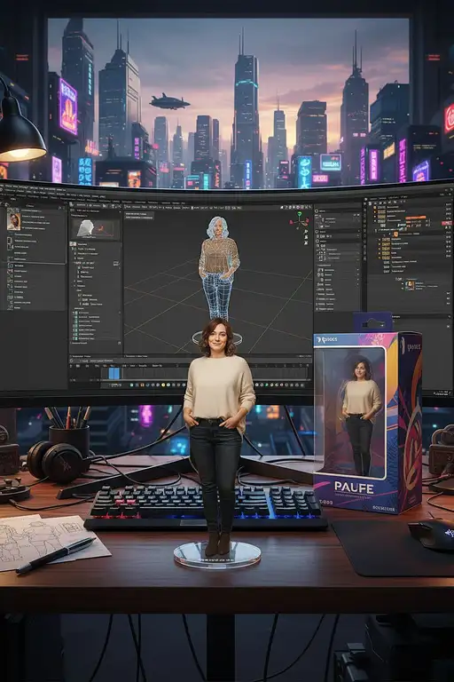 Transforming the photographed person into a realistic 3D figurine in front of a computer desk. The computer screen displays a 3D design drawing of the figurine's software interface. The figurine has a transparent base, and next to it is its matching packaging box, allowing the figurine to be seen. The overall scene is in a realistic style, with the character presented in an ultra-realistic manner. The image quality reaches 4K high definition, the lighting effects are bright and layered, and the colors are saturated and vibrant, showcasing the exquisite imaging effect of high-end photography. Visual Tone: The scene is rich in color and visually impactful. The camera should be able to display different grand backgrounds, with detailed and lively elements in the background, creating an immersive experience.