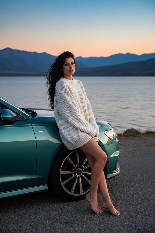 7 hours ago Ultra-realistic portrait, HD, 8K, high definition, rich in professional photographic detail and hyper-realistic textures. Photograph of a slender, fair-skinned woman with long dark hair blowing in the breeze, wearing an oversized white sweater, barefoot, beautiful feet, 5 toes for feet, leaning against a sleek teal Audi A6 parked by a serene lake at sunset. The sky alternates between shades of deep blue and orange, with distant mountains silhouetted against the horizon. SlickRick56 PRO 0 4