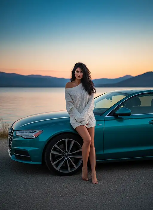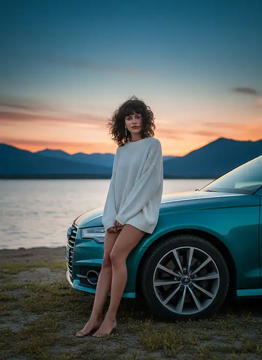 1 month ago Ultra-realistic portrait, HD, 8K, high definition, rich in professional photographic detail and hyper-realistic textures. Photograph of a slender, fair-skinned woman with long dark hair, wearing an oversized white sweater, barefoot, beautiful feet, 5 toes for feet, leaning against a sleek teal Audi A6 parked by a serene lake at sunset. The sky alternates between shades of deep blue and orange, with distant mountains silhouetted against the horizon. wildcat2 PRO 2 38