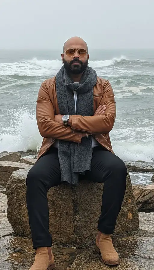 1 day ago Ultra-realistic cinematic autumn portrait of a stylish young man with a lean, toned physique (around 57 kg, 5'6 tall) — his beard remains unchanged, and his head is clean-shaven, giving him a modern, confident bald look. He wears one small, silver hoop earring in each ear, adding a subtle yet refined touch of individuality and style. in uploaded picture (use the same face and facial ) sitting elegantly at old big stone at he is wearing a camel-colored LEATHER jacket layered over a white t-shirt, dark slim-fit trousers, and camel-colored boots. A charcoal gray scarf is wrapped stylishly around my neck, and I’m wearing aviator sunglasses, luxury silver watch. He crosses his arms, looking calm and confident. The lighting is foggy and rainy at daylight with soft fall tones — shades of brown, amber, and sea reflecting on the sunglasses and my outfit. The sea in background has ver high waves. The overall atmosphere feels cinematic, classy, and stylish — like a fashion editorial shot in italy in autumn. --style ultra realistic --lighting foggy fall daylight --color tones warm brown beige amber --focus sharp on face and outfit --high waves,--mood elegant cinematic autumn --details scarf texture, wool coat fabric, warm reflections --8K --v 6 --q 2 --ar 4:5 bads 0 3