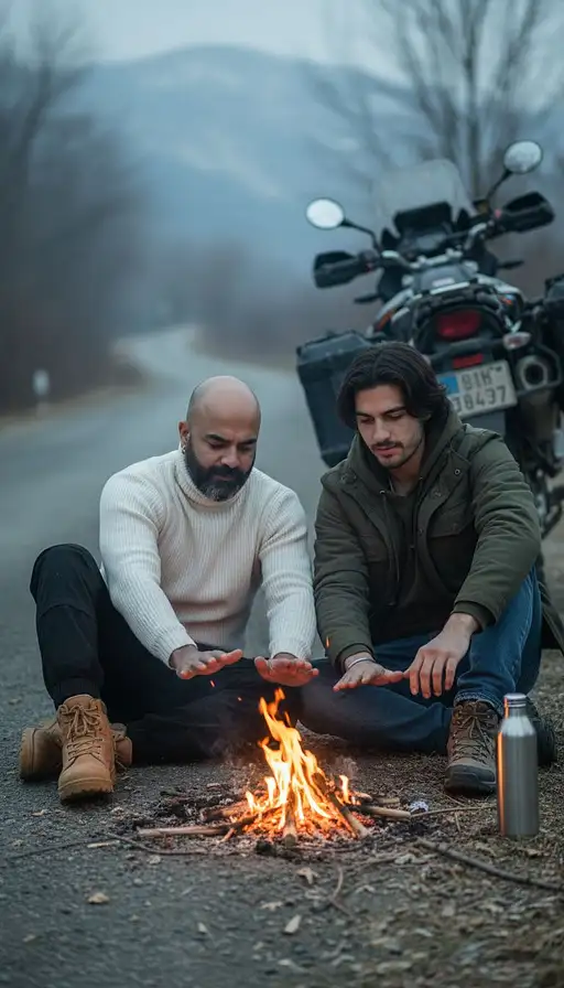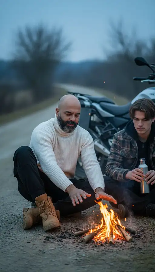 1 hour ago A realistic portrait of a two young man sitting in an outdoor road side setting, warming himself by a small campfire. Behind him is bike showing it backside, with a softly blurred background that creates a cold, realistic atmosphere. Next to him is one water bottle , while the warm glow of the fire reflects gently on his face , one man(first reference image) is wearing white turtleneck sweater and black cargo pant and tan winter shoes, bads 0 1