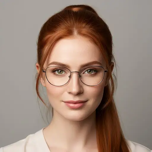 A 29-year-old woman with fiery ginger hair in a ponytail, bright green eyes behind thin stylish glasses, flawless porcelain skin with a light sprinkle of freckles across her nose. Photorealistic clean studio portrait, full head and shoulders visible, centered framing, neutral plain background, sharp focus, ultra-detailed 8k.