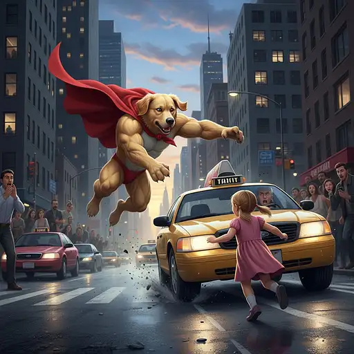 16 days ago Tony the dog, humanoid, heroically jumping to save a child running onto the street, preventing an accident with a speeding car. The scene is dramatic, urban city background with cars and shocked pedestrians. Tony's face shows courage and urgency, human-like expressions. His body language is dynamic, like a superhero dog, saving the child." 7a7d8e71df7 0 11