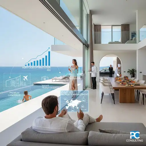 3 days ago *"An ultra-luxury family lifestyle scene inside a modern seaside villa. A refined UHNW family (parents + 1 child) enjoying relaxed moments: the father reviewing a digital tablet with a property portfolio map, the mother sipping champagne on a terrace with sea view, the child playing near the pool. Discreet butler in white gloves serving drinks, private chef arranging a gourmet table, chauffeur waiting by a luxury car at the entrance. In the background, subtle overlays symbolizing PC Consulting services: • Multi-site Property Management → glowing map with villa icons across Europe (St-Tropez, Courchevel, Ibiza, Tuscany). • Portfolio Optimisation → elegant holographic charts showing ROI. • Estate Transformation → blueprint of a villa overlayed on glass. • Premium Concierge → subtle AI concierge icons (reservations, travel, services). Atmosphere: serene, exclusive, family-focused, with a balance between luxury hospitality and financial sophistication. White & blue PC Consulting palette, editorial photography style, premium lifestyle aesthetic."* Paddysss 0 5