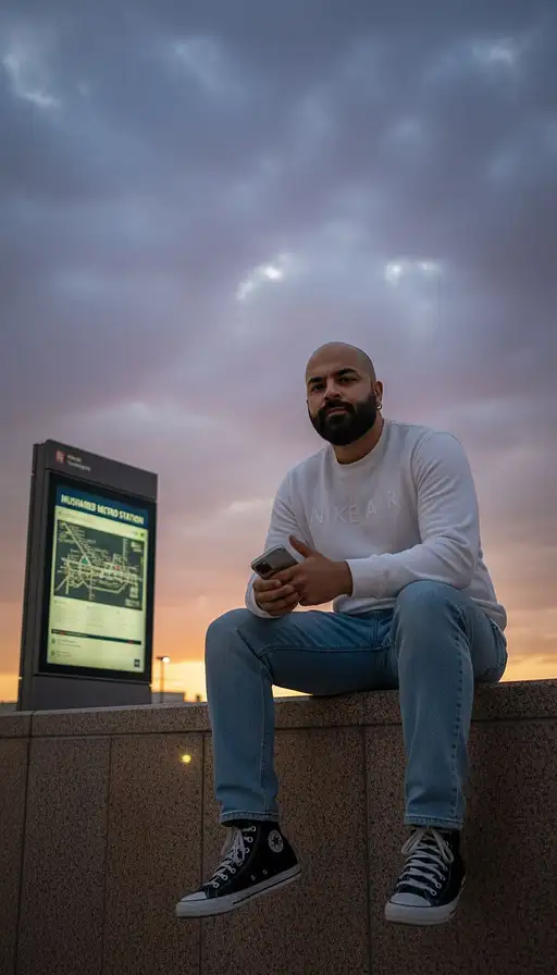 Create the image, and don't change the face. The image shows a stylish young man with a lean, toned physique (around 57 kg, 5'6 tall) — his beard remains unchanged, and his head is clean-shaven, giving him a modern, confident bald look. He wears one small, silver hoop earring in each ear, adding a subtle yet refined touch of individuality and style. sitting on a low, polished stone wall. He is dressed casually in a red crewneck sweatshirt with "NIKE AIR" printed in white across the chest, paired with light-wash blue jeans that are slightly baggy. On his feet, he wears black high-top Converse sneakers with white laces and soles. He is holding a small, silvery item in his hands. The background is a cloudy, dusky sky, suggesting it's either sunrise or sunset. To the left of the man, a green-lit information board, possibly a map or a sign for a subway station, is visible with English text that appears to say "musherib metro station." The scene is shot from a low angle, emphasizing the subject against the dramatic sky and the urban backdrop.
