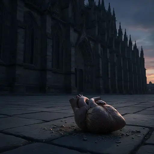 2 days ago Ultra-realistic cinematic photo of a Gothic cathedral at dusk. On the stone pavement in front, a detailed anatomical heart specimen lies on the ground, slightly dirty and trampled, as if neglected. DSLR photography, 8k resolution, sharp textures, moody lighting, medical realism. 597297a32d0 PRO 0 5
