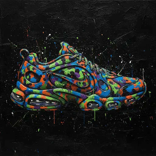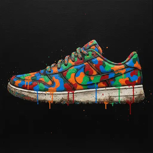 17 days ago artistic painting art, side view, Nike conceptual sneakers design, distinctive vibrant camouflage pattern, solid black background, dirty painted expression, realistic texture, rich details --ar 9:16 --style raw --stylize 400 joelscahn 0 9