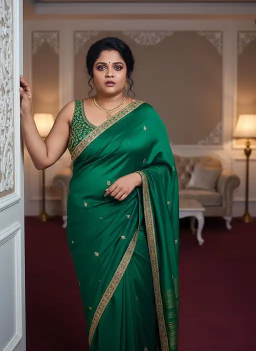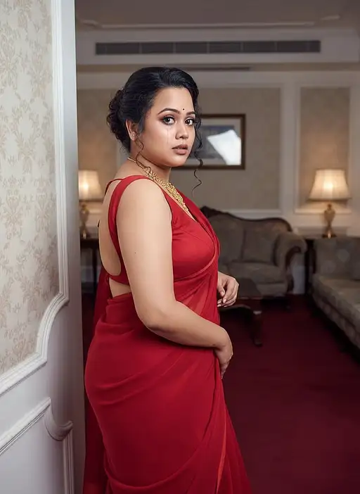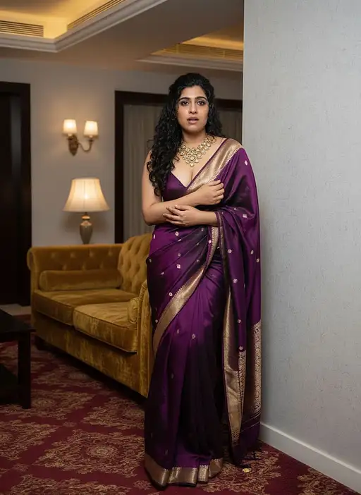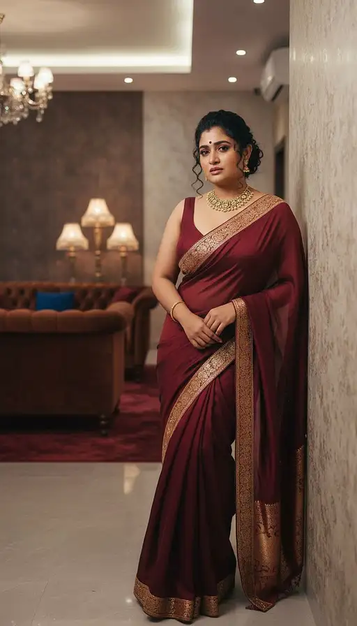 full body view of most beautiful girl as most beautiful indian realstic girl with plus size FLAT stomach , breast size 44 FF, waist 30 , hips 48 , under hips 38, most beautiful girl in elegant bold color saree and long curly hairs, hairs tied up with hair style stylishly, necklace, big wide black eyes, full face, 44F 30 48 figure, makeup, low cut neck, SLEEVLESS, LOW CUT BACK, girl embracing with emotion and possessive feeling, standing support with a wall, bitting her lips, modern elite photo room, with luxury sofa set, most beautiful girl in elegant bold color saree and long curly hairs, hairs tied up with hair style stylishly, necklace, big wide black eyes, full face, makeup, low cut neck, SLEEVLESS, DEEP CUT NECK AND BACK, girl embracing with emotion and possessive feeling, emotional crying with longing feeling, innocence and ecstasy, background, spacious modern elite photo room, with luxury sofa set, MAROON color carpet, elegant interior designs, vintage lamps, romantic reunion ambience, photorealistic, vibrant colors, intricate details, 8k.et, elegant interior designs, vintage lamps, romantic reunion ambience, photorealistic, vibrant colors, intricate details, 8k.