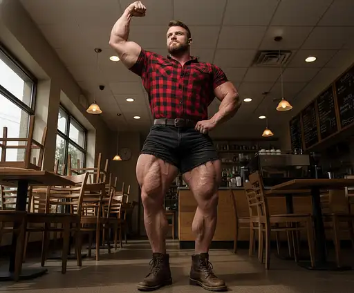 16 days ago At a coffee shop with no customers, the bodybuilder is 6'4" tall, he has huge muscular shoulders and super extra huge muscular legs, he is wearing a lumber jack shirt short sleeve, black jean- short-shorts, dark brown belt and dark brown leather boots. He is posing and flexing with one of his arms up right and the other hand on his waist. He has one foot on top of a chair. with his head facing up right, like a champion. The view perspective of the image is from the floor up. Straight4gay PRO 0 9