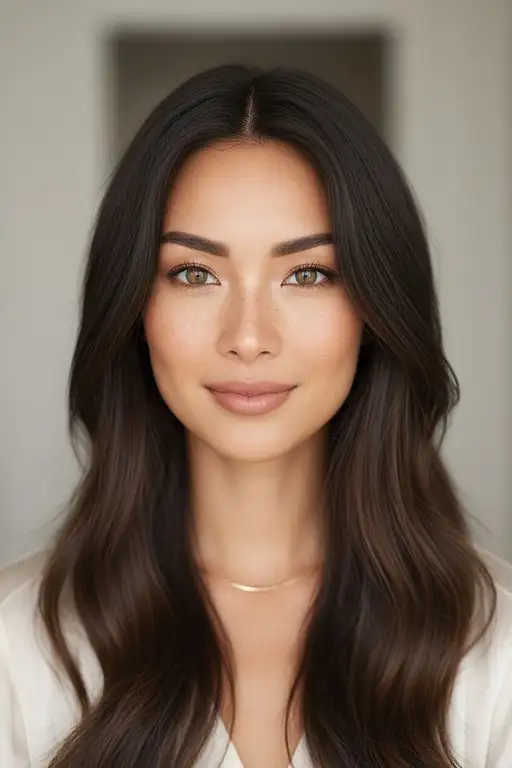 Generate a woman : Gender: Female Age: 35 Hair (length, color, texture, part): Long, dark brown, slightly wavy, parted slightly off-center Skin tone (optional): Light-medium with warm undertones Eye color (optional): Hazel (brown with green tones) Other traits to stay consistent: Mixed heritage: half Korean, half Hungarian Slim, feminine oval face shape Natural, minimal makeup look Soft, full eyebrows (medium thickness, natural arch) Smooth, clear skin with subtle freckles Warm, approachable expression