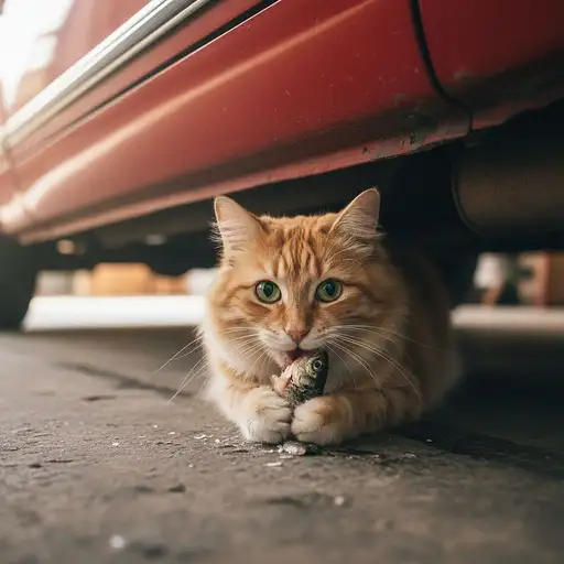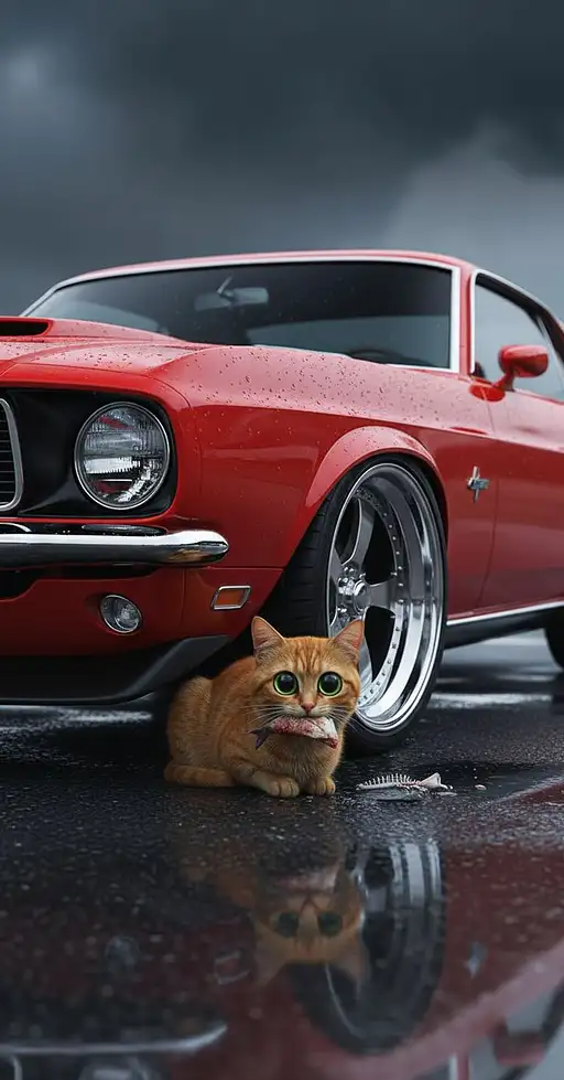 11 days ago An orange cat with big innocent eyes sits under a red car and is eating fish. 16585c46b27 0 8