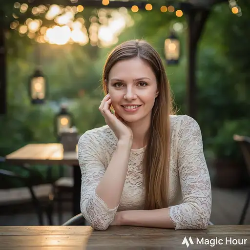 3 days ago "Image is a high-resolution portrait photograph captured with a Sony A1 50.1 MB camera using a 100mm prime lens. Featuring A beautiful lithe stylish Australian woman in her mid 30's, with dark blonde hair cascading down her back and piercing amber eyes that sparkle with joy, a warm yet hesitant smile spreading across her full lips. She is wearing a cream lace top . She is sitting in an external garden at a rustic wooden family table at a cozy restaurant, her elegant hand resting on her cheek with fingers splayed. The background is subtly blurred, a scenic garden exterior setting with soft bokeh lights behind her during a sunset moment." 66111d8fed2 0 11